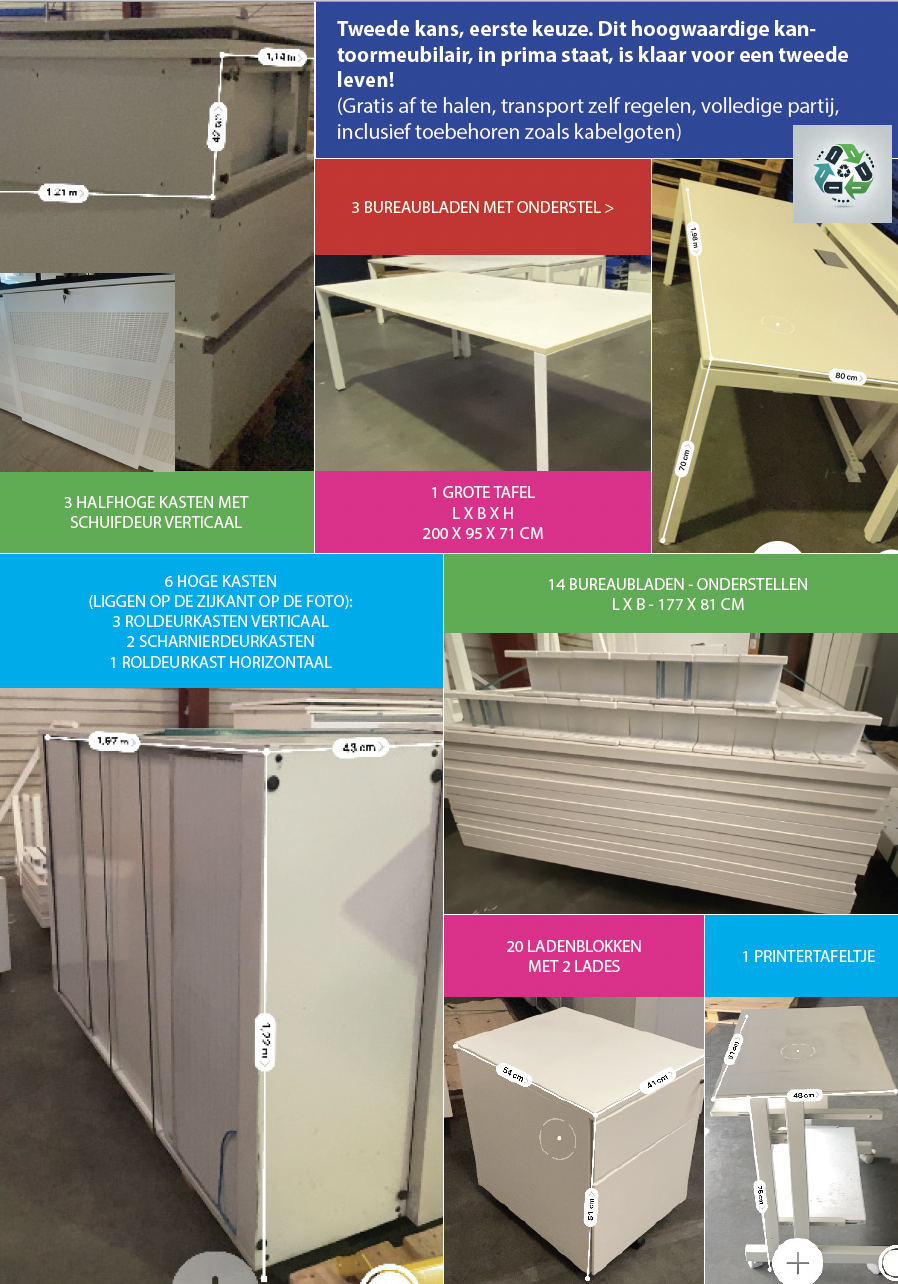 Onze voormalige bureautafels en kasten staan klaar voor een nieuw avontuur. Deze kwalitatieve meubelstukken verdienen een tweede leven en zijn perfect voor werkruimtes, creatieve hubs, jeugdverenigingen, co-working spaces, start-ups, scholen, en meer.
